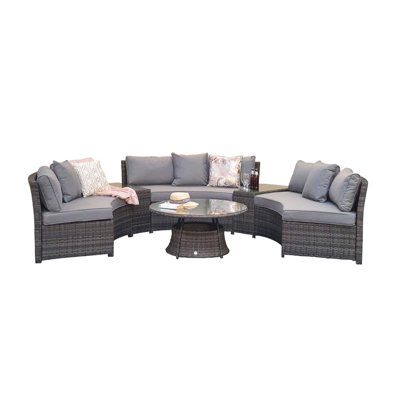 Introducing the Juliet Half Moon Sofa Dining Set, meticulously designed for luxury and comfort in your outdoor living space. This premium set features a distinctive half-moon shaped sofa arrangement in a chic mixed grey 8mm flat weave rattan, ideal for hosting or relaxing in style.