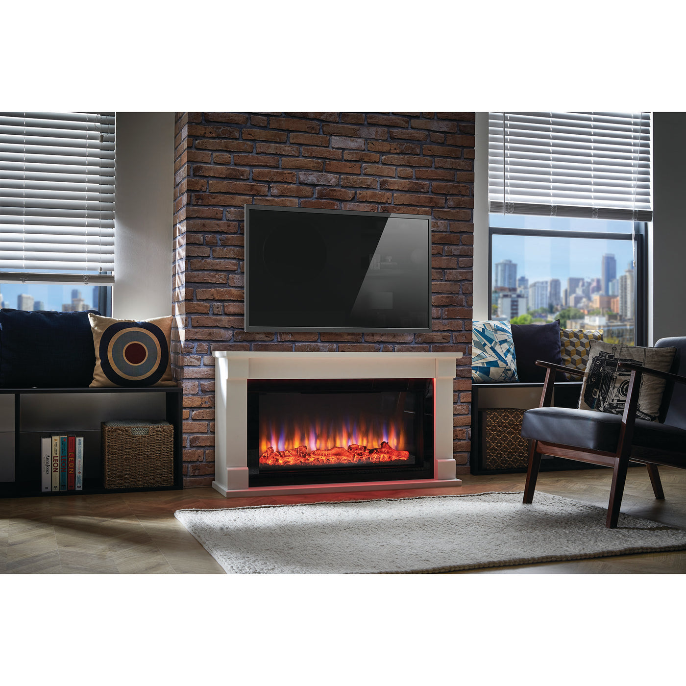 Contemporary Warmth with LED Mood Lighting. Immerse yourself in the serene beauty and functionality of the Suncrest Bradbury-Ambience Electric Fireplace Suite. This low-level unit, with its sleek textured white finish, brings a contemporary elegance to any room, offering both aesthetic appeal and practical warmth. At its core lies a landscape electric fire that captures attention with its realistic log effect and adjustable flame brightness, providing the allure of a traditional fireplace without any maintenance concerns.